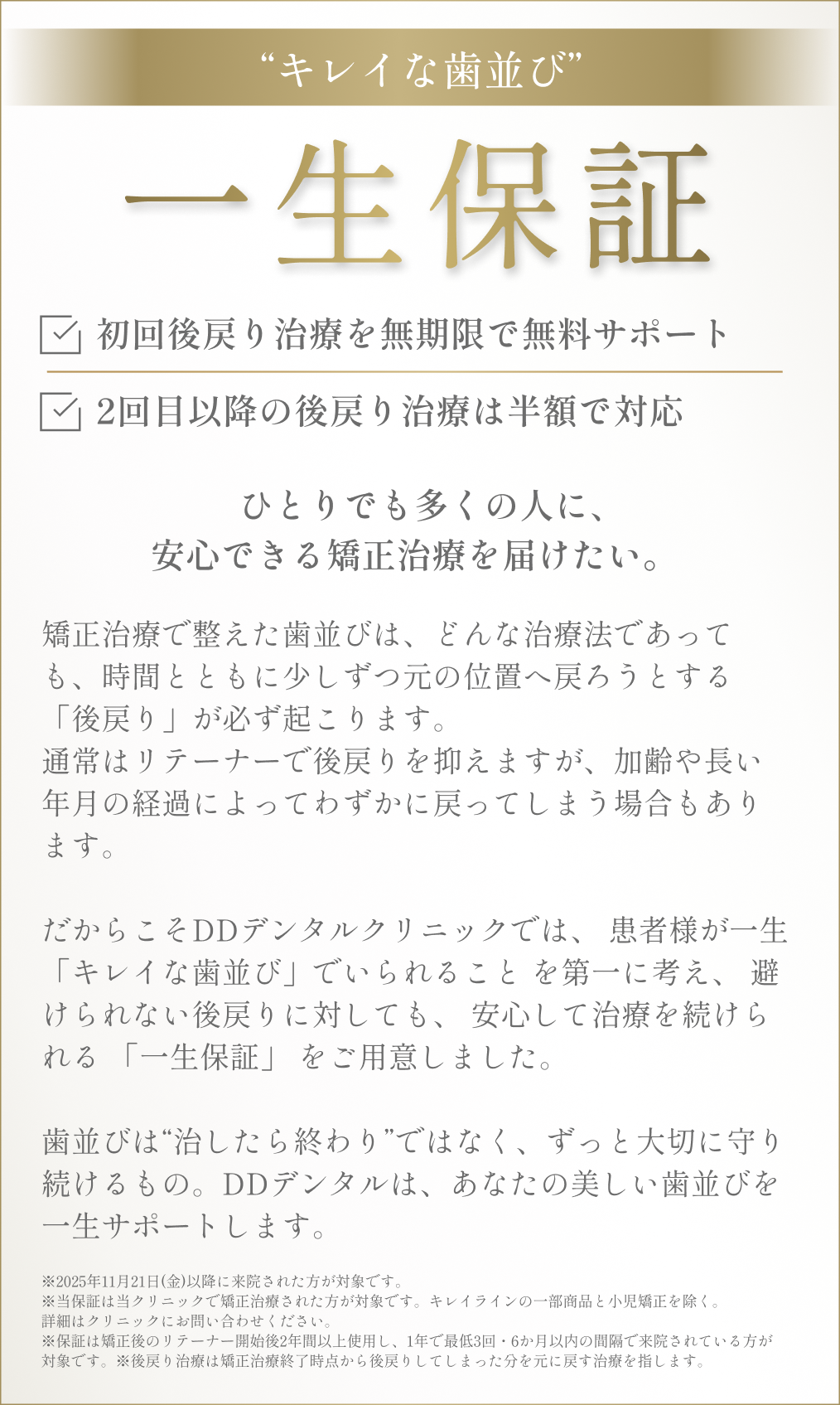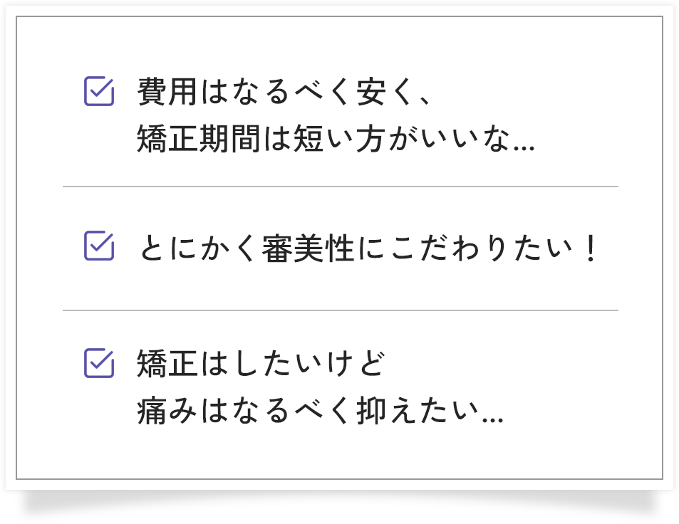 当クリニックでは手が届く価格設定にこだわり、矯正治療のハードルを下げることで、より多くの方が矯正治療を受け、健康的で美しい口元をめざせるように取り組んでいます。
